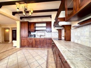 Классическая итальянская кухня из массива дерева уже установлена: широкая рабочая зона, встроенная техника, уютная обеденная зона у окна.