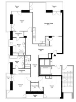 Квартира без ремонта, что дает вам возможность воплотить все свои дизайнерские идеи и создать пространство, полностью соответствующее вашим вкусам и потребностям. Планировка позволяет обустроить два совмещенных и два отдельных санузла, что особенно удобно для большой семьи или приемов гостей.