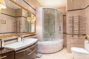 Душевой кабиной итальянской фирмы GLASS с джакузи и паровой баней, а также унитазом и биде от Villeroy & Boch.
