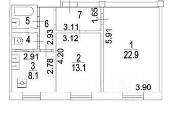 Общая площадь - 56.7 кв.м, две изолированные комнаты - 22.9 кв.м и 13,1кв.м, просторная кухня - 9 кв.м, коридор,