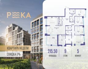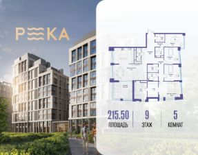 Продается просторная квартира площадью 215.50 м2 в жилом комплексе РЕКА. Квартира находится в 1 секции корпуса 3 (будет введен в эксплуатацию в 4 кв. 2026). Этаж 9-й из 16.