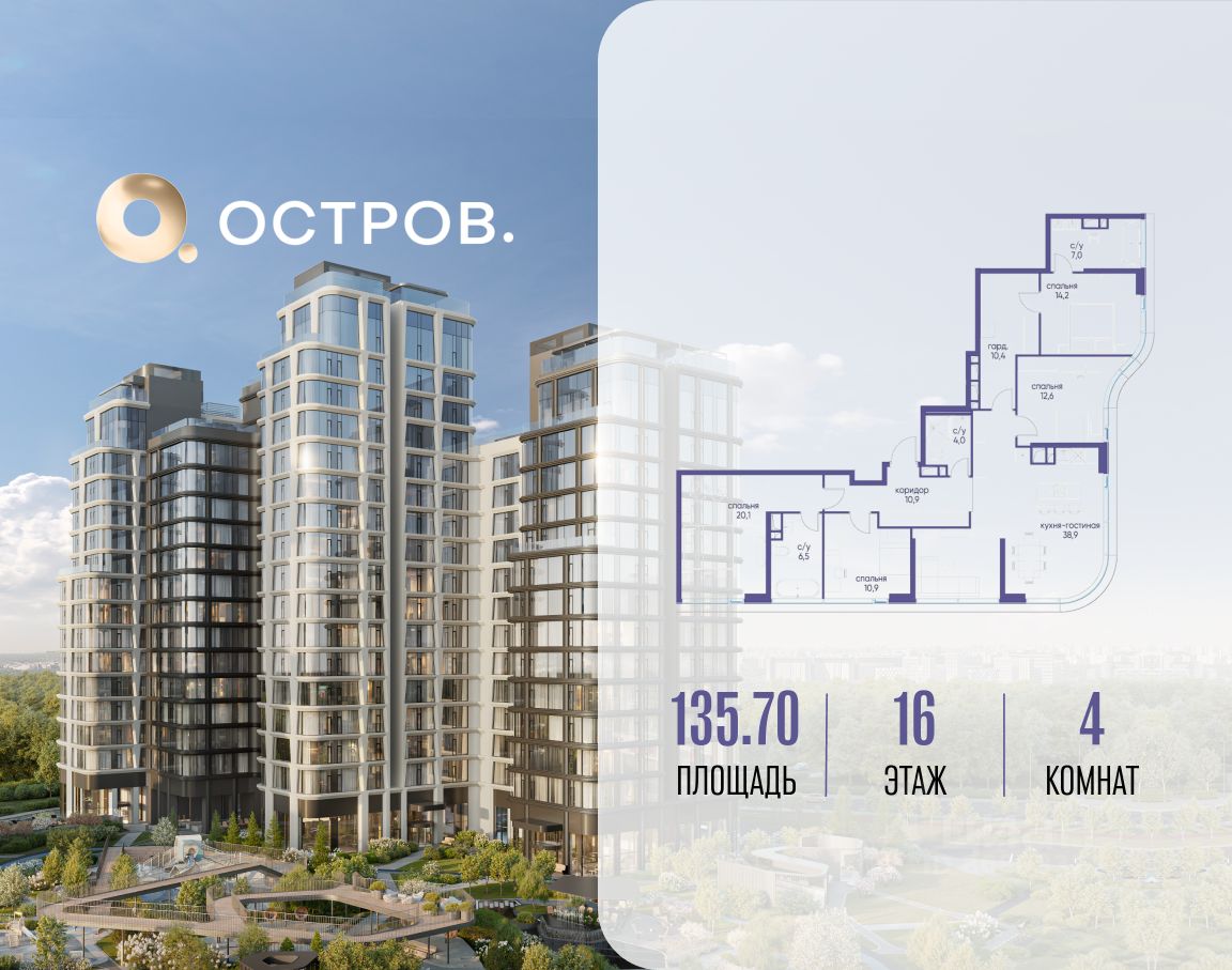 Продаётся 4-комн. квартира от застройщика: общая площадь 135.70 м², жилая 57.80 м², кухня 38.90 м², 16-й этаж, жилой квартал "Остров 12", корпус 3 (секция 1). Срок сдачи: 1 квартал 2029 года.