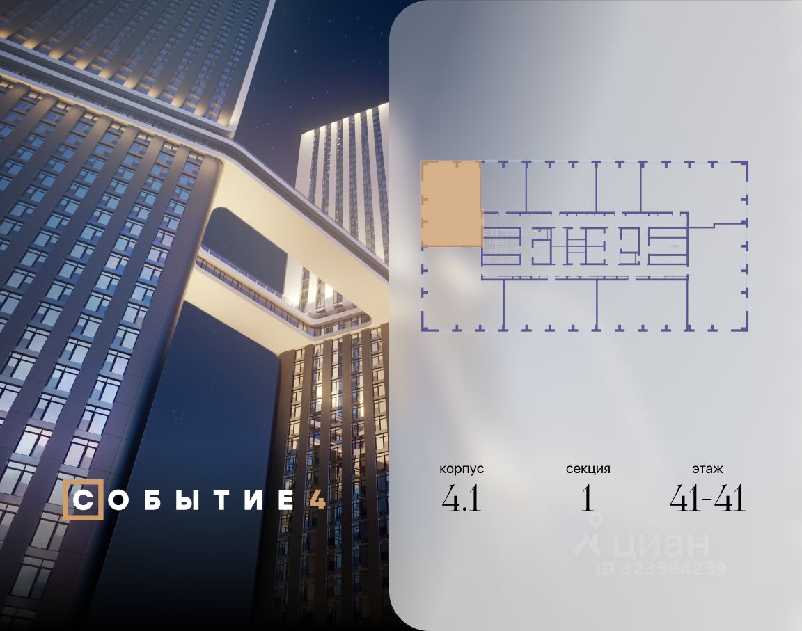 Продаётся 3-комнатная квартира от застройщика: общая площадь 102.10 м², жилая 43.20 м², кухня 23.90 м², 41-й этаж, жилой квартал "Событие-4", корпус 1 (секция 1) Срок сдачи: 1 квартал 2026 года.