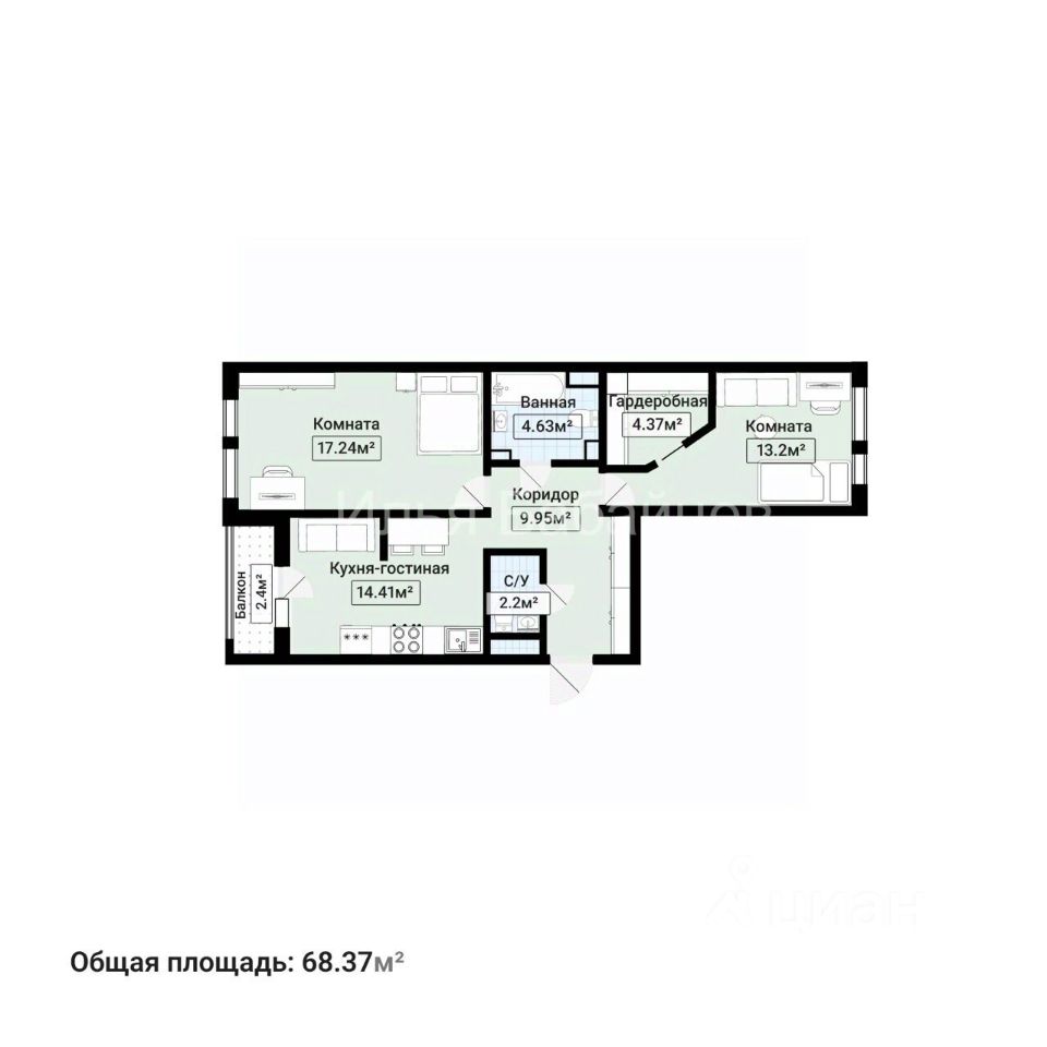 - Продуманная планировка: Светлые комнаты с окнами на две стороны (17,6 м² и 17,2 м²), просторная кухня-гостиная (14,41 м²), утепленная лоджия (2,4 м²), два санузла, гардеробная. По всей квартире теплые полы.
