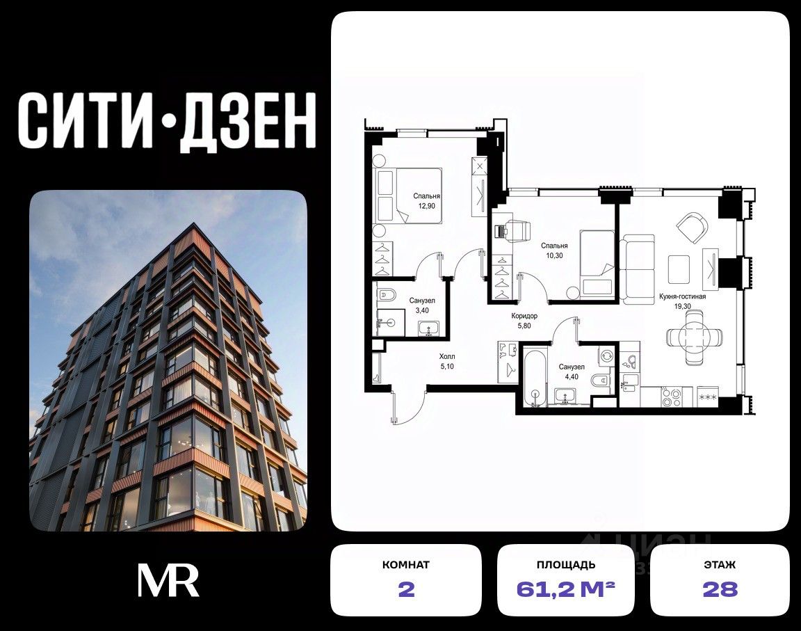 Продается 2-комнатная квартира от застройщика в жилом мультиквартале СИТИДЗЕН на 28-м этаже в корпусе #2. Общая площадь лота составляет 61.20 м²