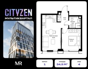 Продается 1-комнатная квартира от застройщика в жилом мультиквартале CITYZEN на 4-м этаже в корпусе #2 урбан-блока PARUS. Общая площадь лота составляет 34.50 м²