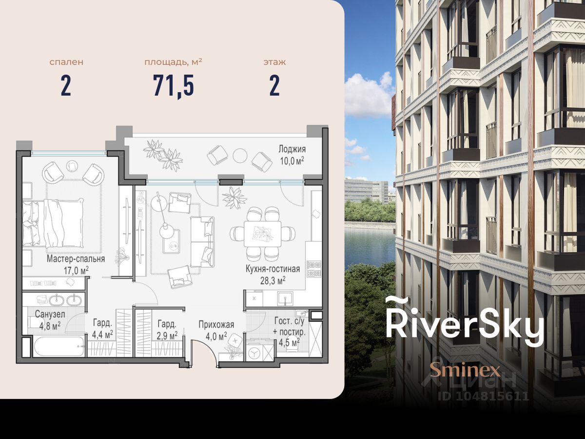 Прямая продажа от застройщика. В жилом квартале, расположенном в Даниловском районе Москвы, продаётся 2-комнатная квартира площадью 71.50 кв.м без отделки. Квартира расположена на 2 этаже 12-этажного дома, корпус 8, в жилом квартале бизнес-класса RiverSky, который является частью жилого квартала FORIVER.
