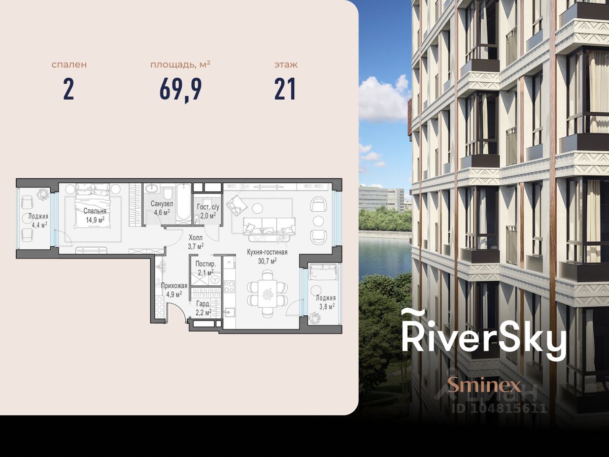 Прямая продажа от застройщика. В жилом квартале, расположенном в Даниловском районе Москвы, продаётся 2-комнатная квартира площадью 69.90 кв.м без отделки. Квартира расположена на 21 этаже 21-этажного дома, корпус 6, в жилом квартале бизнес-класса RiverSky, который является частью жилого квартала FORIVER.