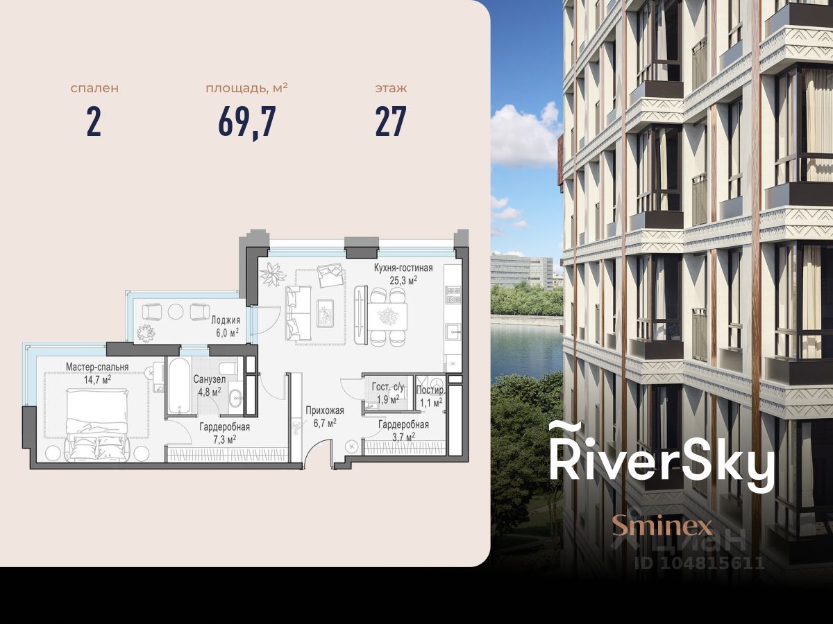 Прямая продажа от застройщика. В жилом квартале, расположенном в Даниловском районе Москвы, продаётся 2-комнатная квартира площадью 69.70 кв.м без отделки. Квартира расположена на 27 этаже 27-этажного дома, корпус 3, в жилом квартале бизнес-класса RiverSky, который является частью жилого квартала FORIVER.
