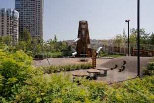 Квартал продуман до мелочей. В нём обустроен двор с газонами и прогулочными аллеями, видовыми площадками для отдыха с деревянными шезлонгами и перголами. Резиденты будут наслаждаться эффектной панорамой Москвы-реки с шестиметровой возвышенности стилобата.