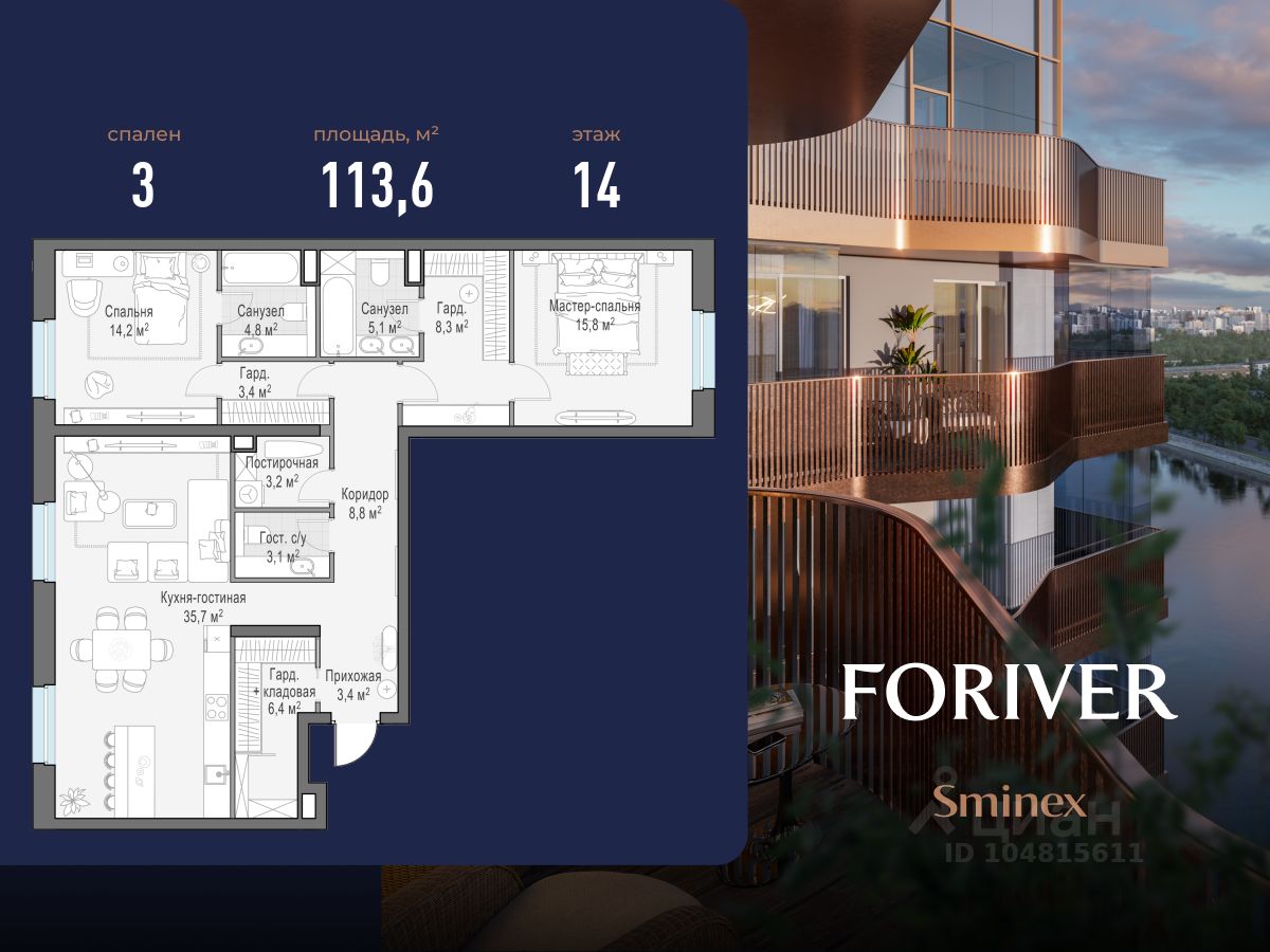 Прямая продажа от застройщика. В жилом квартале, расположенном в Даниловском районе Москвы, продаётся 3-комнатная квартира площадью 113.60 кв.м без отделки. Квартира расположена на 14 этаже 14-этажного дома, корпус Line 2, в жилом квартале бизнес-класса Foriver.