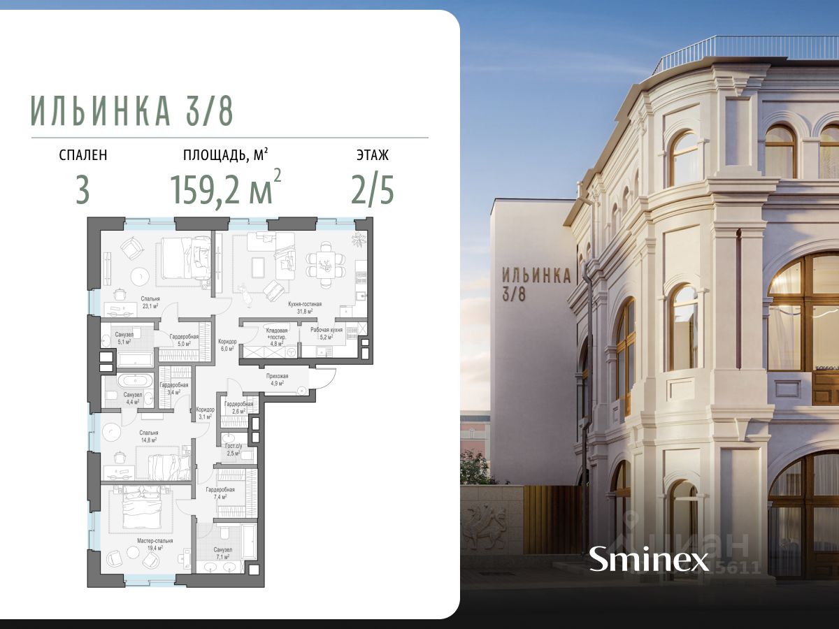"Ильинка 3/8" - cамая близкая к Кремлю и Красной площади коллекция клубных особняков. Дом расположен на месте Тёплых торговых рядов: 160 м до Красной площади, 300 м до Кремля, 500 м до Администрации Президента. Ранее в этой исторической локации проживали представители царских сословий. По соседству находятся одна из старейших в городе Богоявленская церковь и Биржевая площадь. Расположение дарит жителям комфорт и разнообразие: пересечение Ильинки и тихого Богоявленского переулка с минимальным трафиком автомобилей, близость Никольской улицы с её насыщенной инфраструктурой - от топовых бутиков до ресторанов Michelin. "Ильинка 3/8" - это 7 эксклюзивных и роскошных особняков: 3 деликатно реконструированных исторических и 4 новых. В них представлена инфраструктура только для своих: красивый двор-сад с парадной и торжественной входной группой; лобби-бар для встреч, где можно подождать домочадцев, выпить чашечку кофе или взять её с собой; бесплатный фитнес по стандарту инфраструктуры для здорового образа жизни FIT LAB, общественная гостиная по стандарту FRIENDS LAB для знакомства и совместного времяпрепровождения соседей в доме. В клубных особняках представлены самые полные и лучшие в своём классе системы комфорта. О жителях и доме заботится Служба комфорта Smineх, которая предлагает сервис уровня 5-звёздочных отелей и сохраняет изначальный облик и концепцию дома. Девелопер проекта - Sminex, который специализируется на создании комфортной и престижной среды для жизни и работы.