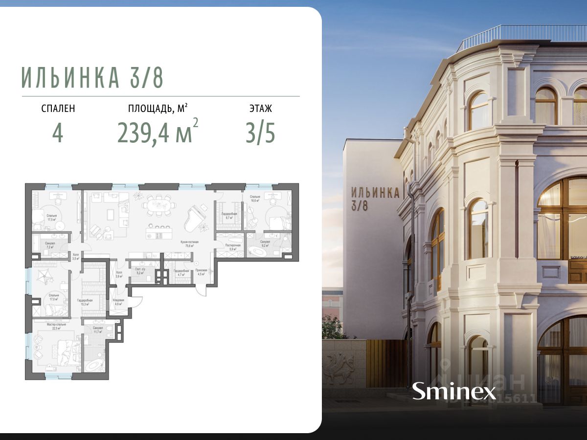 "Ильинка 3/8" - cамая близкая к Кремлю и Красной площади коллекция клубных особняков. Дом расположен на месте Тёплых торговых рядов: 160 м до Красной площади, 300 м до Кремля, 500 м до Администрации Президента. Ранее в этой исторической локации проживали представители царских сословий. По соседству находятся одна из старейших в городе Богоявленская церковь и Биржевая площадь. Расположение дарит жителям комфорт и разнообразие: пересечение Ильинки и тихого Богоявленского переулка с минимальным трафиком автомобилей, близость Никольской улицы с её насыщенной инфраструктурой - от топовых бутиков до ресторанов Michelin. "Ильинка 3/8" - это 7 эксклюзивных и роскошных особняков: 3 деликатно реконструированных исторических и 4 новых. В них представлена инфраструктура только для своих: красивый двор-сад с парадной и торжественной входной группой; лобби-бар для встреч, где можно подождать домочадцев, выпить чашечку кофе или взять её с собой; бесплатный фитнес по стандарту инфраструктуры для здорового образа жизни FIT LAB, общественная гостиная по стандарту FRIENDS LAB для знакомства и совместного времяпрепровождения соседей в доме. В клубных особняках представлены самые полные и лучшие в своём классе системы комфорта. О жителях и доме заботится Служба комфорта Smineх, которая предлагает сервис уровня 5-звёздочных отелей и сохраняет изначальный облик и концепцию дома. Девелопер проекта - Sminex, который специализируется на создании комфортной и престижной среды для жизни и работы.
