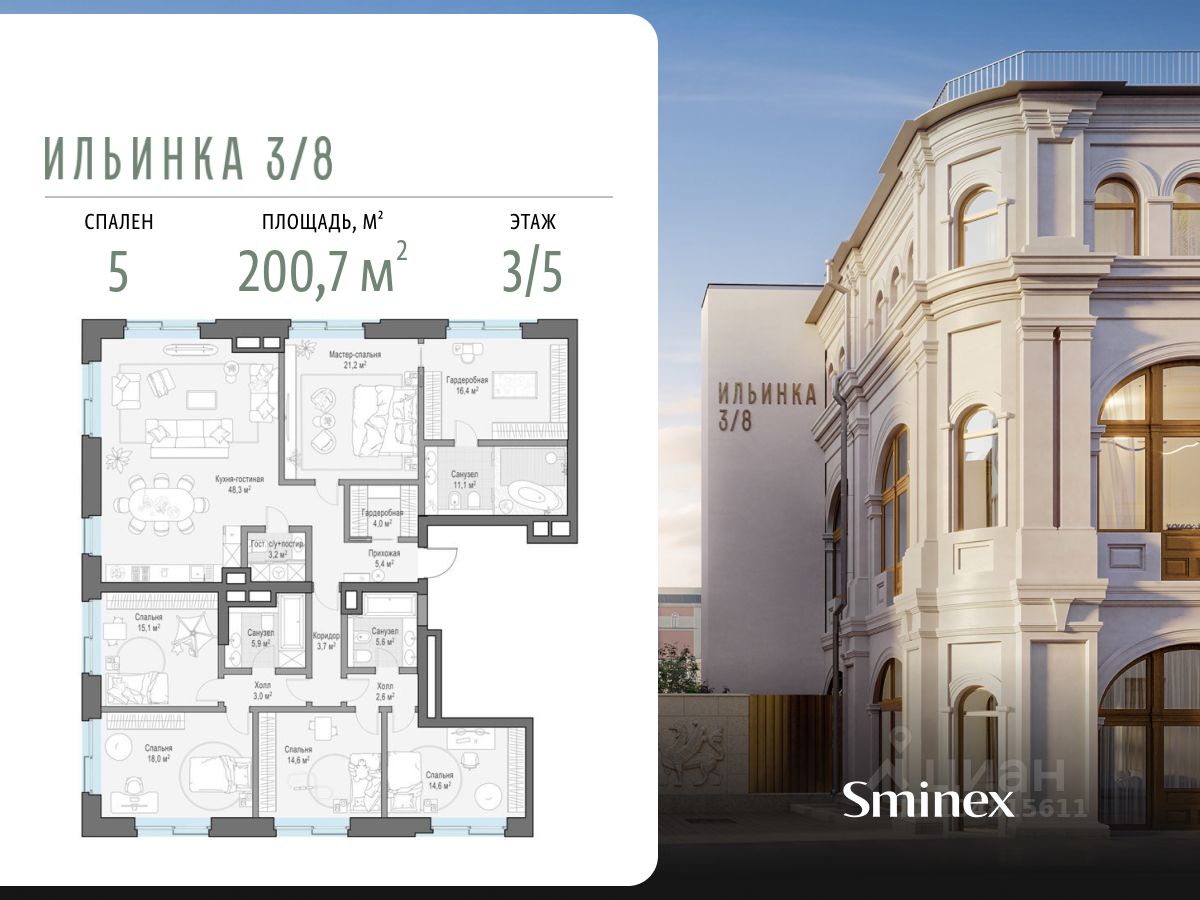 "Ильинка 3/8" - cамая близкая к Кремлю и Красной площади коллекция клубных особняков. Дом расположен на месте Тёплых торговых рядов: 160 м до Красной площади, 300 м до Кремля, 500 м до Администрации Президента. Ранее в этой исторической локации проживали представители царских сословий. По соседству находятся одна из старейших в городе Богоявленская церковь и Биржевая площадь. Расположение дарит жителям комфорт и разнообразие: пересечение Ильинки и тихого Богоявленского переулка с минимальным трафиком автомобилей, близость Никольской улицы с её насыщенной инфраструктурой - от топовых бутиков до ресторанов Michelin. "Ильинка 3/8" - это 7 эксклюзивных и роскошных особняков: 3 деликатно реконструированных исторических и 4 новых. В них представлена инфраструктура только для своих: красивый двор-сад с парадной и торжественной входной группой; лобби-бар для встреч, где можно подождать домочадцев, выпить чашечку кофе или взять её с собой; бесплатный фитнес по стандарту инфраструктуры для здорового образа жизни FIT LAB, общественная гостиная по стандарту FRIENDS LAB для знакомства и совместного времяпрепровождения соседей в доме. В клубных особняках представлены самые полные и лучшие в своём классе системы комфорта. О жителях и доме заботится Служба комфорта Smineх, которая предлагает сервис уровня 5-звёздочных отелей и сохраняет изначальный облик и концепцию дома. Девелопер проекта - Sminex, который специализируется на создании комфортной и престижной среды для жизни и работы.