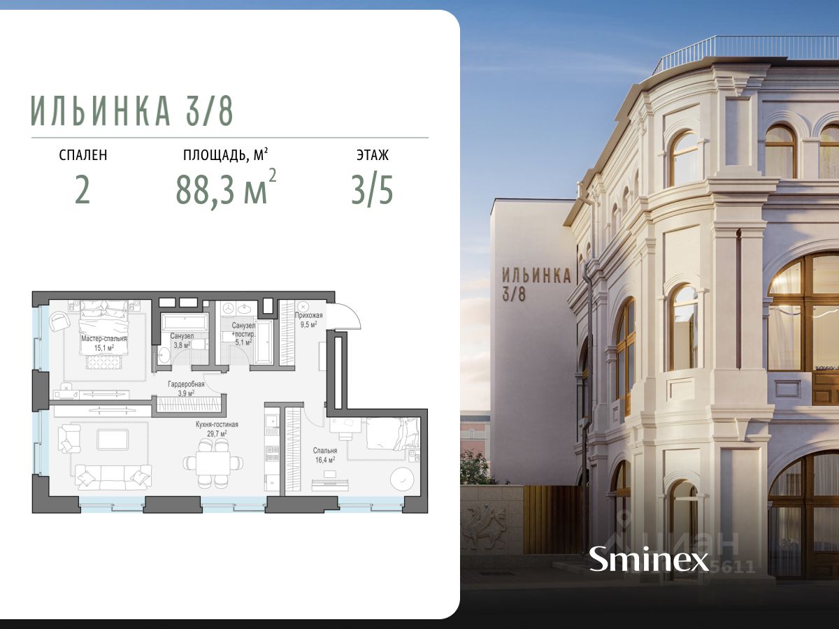 "Ильинка 3/8" - cамая близкая к Кремлю и Красной площади коллекция клубных особняков. Дом расположен на месте Тёплых торговых рядов: 160 м до Красной площади, 300 м до Кремля, 500 м до Администрации Президента. Ранее в этой исторической локации проживали представители царских сословий. По соседству находятся одна из старейших в городе Богоявленская церковь и Биржевая площадь. Расположение дарит жителям комфорт и разнообразие: пересечение Ильинки и тихого Богоявленского переулка с минимальным трафиком автомобилей, близость Никольской улицы с её насыщенной инфраструктурой - от топовых бутиков до ресторанов Michelin. "Ильинка 3/8" - это 7 эксклюзивных и роскошных особняков: 3 деликатно реконструированных исторических и 4 новых. В них представлена инфраструктура только для своих: красивый двор-сад с парадной и торжественной входной группой; лобби-бар для встреч, где можно подождать домочадцев, выпить чашечку кофе или взять её с собой; бесплатный фитнес по стандарту инфраструктуры для здорового образа жизни FIT LAB, общественная гостиная по стандарту FRIENDS LAB для знакомства и совместного времяпрепровождения соседей в доме. В клубных особняках представлены самые полные и лучшие в своём классе системы комфорта. О жителях и доме заботится Служба комфорта Smineх, которая предлагает сервис уровня 5-звёздочных отелей и сохраняет изначальный облик и концепцию дома. Девелопер проекта - Sminex, который специализируется на создании комфортной и престижной среды для жизни и работы.