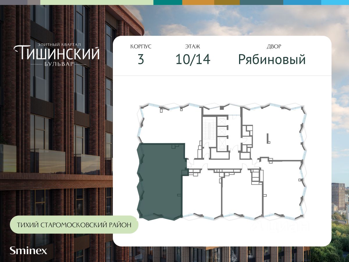 "Тишинский бульвар" - тихий зелёный элитный квартал на Тишинке, в престижном и комфортном районе центра Москвы. В нём создан уникальный для элитного дома прогулочный бульвар в своём огромном парке 1,9 га. В парке оборудованы зоны для активного и тихого отдыха, крытые галереи, приватные зелёные комнаты, многофункциональная спортивная площадка, воркаут-зона, детская площадка, сухой фонтан, ручей.