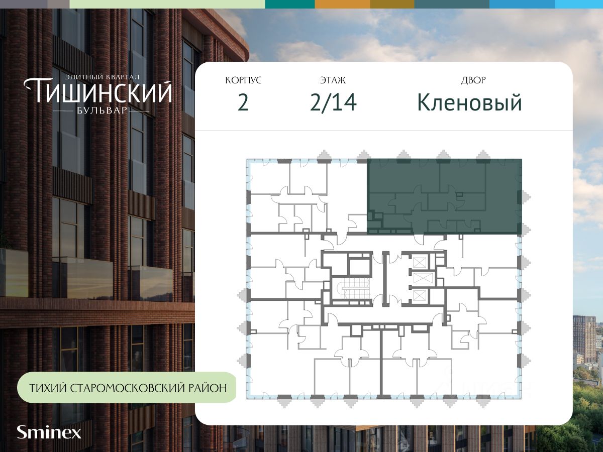"Тишинский бульвар" - тихий зелёный элитный квартал на Тишинке, в престижном и комфортном районе центра Москвы. В нём создан уникальный для элитного дома прогулочный бульвар в своём огромном парке 1,9 га. В парке оборудованы зоны для активного и тихого отдыха, крытые галереи, приватные зелёные комнаты, многофункциональная спортивная площадка, воркаут-зона, детская площадка, сухой фонтан, ручей.