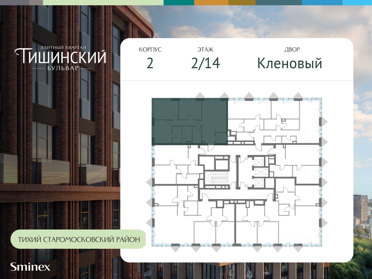 "Тишинский бульвар" - тихий зелёный элитный квартал на Тишинке, в престижном и комфортном районе центра Москвы. В нём создан уникальный для элитного дома прогулочный бульвар в своём огромном парке 1,9 га. В парке оборудованы зоны для активного и тихого отдыха, крытые галереи, приватные зелёные комнаты, многофункциональная спортивная площадка, воркаут-зона, детская площадка, сухой фонтан, ручей.