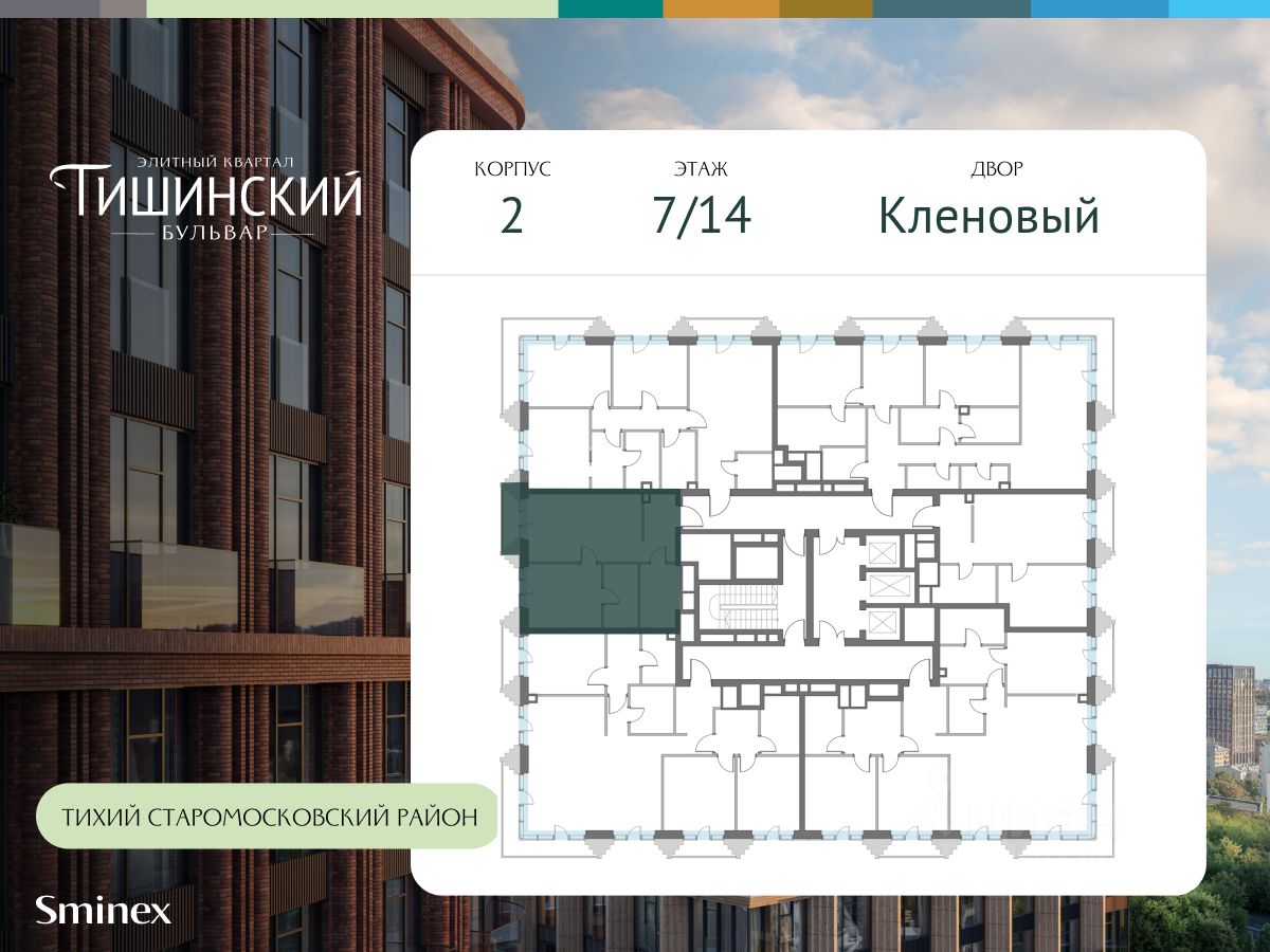 "Тишинский бульвар" - тихий зелёный элитный квартал на Тишинке, в престижном и комфортном районе центра Москвы. В нём создан уникальный для элитного дома прогулочный бульвар в своём огромном парке 1,9 га. В парке оборудованы зоны для активного и тихого отдыха, крытые галереи, приватные зелёные комнаты, многофункциональная спортивная площадка, воркаут-зона, детская площадка, сухой фонтан, ручей.