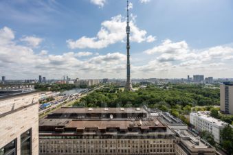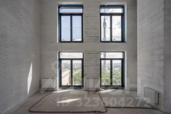 Двухуровневый пентхаус с просторной террасой 12,6 м. Высота потолка - 6,5 м. В кухне-гостиной дровяной камин и два французских балкона. Окна выходят на Восток, открывается впечатляющий вид на зеленый массив парка Дубовая роща и Останкинскую телебашню.