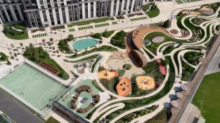 В центральной части парка расположен амфитеатр со сценой для представлений и проведения мероприятий. Для гармоничного развития маленьких жителей - пространства по стандарту Kid`s Lab для гармоничного развития детей всех возрастов: детская площадка, игровая комната, рельефная площадка для общения со сверстниками, где можно заниматься паркуром, танцевать и играть в настольный теннис.