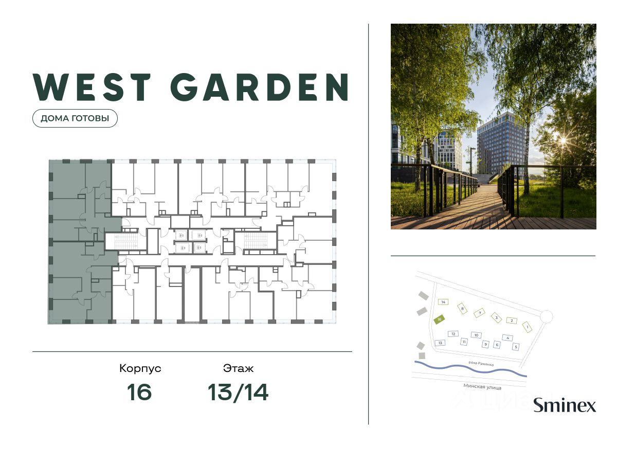 West Garden - это собрание клубных домов высотой 12-14 этажей в собственном парке 16 гектаров вдоль реки. Просторный среднеэтажный квартал расположен на Минской улице, в респектабельном Западном округе столицы. Вокруг премиальное окружение и более 1000 гектаров парков.