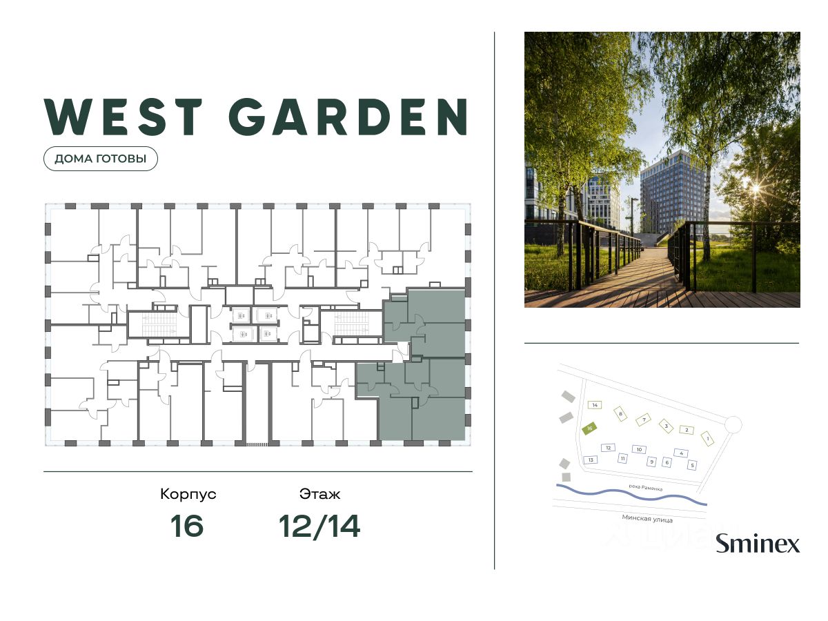 West Garden - это собрание клубных домов высотой 12-14 этажей в собственном парке 16 гектаров вдоль реки. Просторный среднеэтажный квартал расположен на Минской улице, в респектабельном Западном округе столицы. Вокруг премиальное окружение и более 1000 гектаров парков.