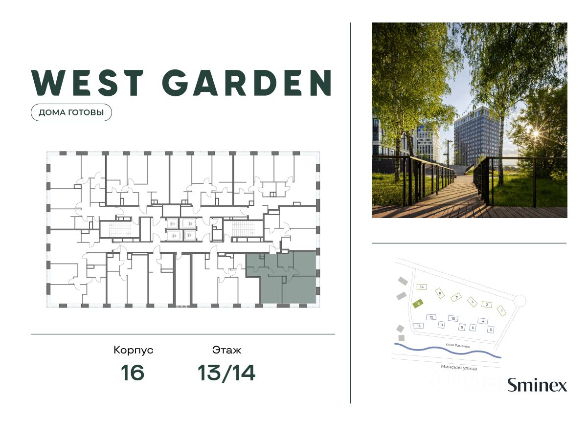 West Garden - это собрание клубных домов высотой 12-14 этажей в собственном парке 16 гектаров вдоль реки. Просторный среднеэтажный квартал расположен на Минской улице, в респектабельном Западном округе столицы. Вокруг премиальное окружение и более 1000 гектаров парков.
