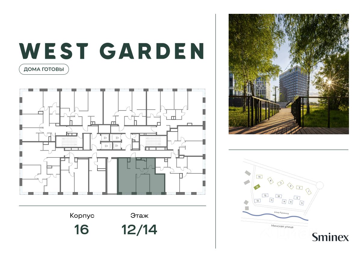 West Garden - это собрание клубных домов высотой 12-14 этажей в собственном парке 16 гектаров вдоль реки. Просторный среднеэтажный квартал расположен на Минской улице, в респектабельном Западном округе столицы. Вокруг премиальное окружение и более 1000 гектаров парков.