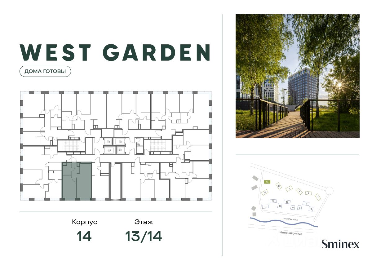 West Garden - это собрание клубных домов высотой 12-14 этажей в собственном парке 16 гектаров вдоль реки. Просторный среднеэтажный квартал расположен на Минской улице, в респектабельном Западном округе столицы. Вокруг премиальное окружение и более 1000 гектаров парков.
