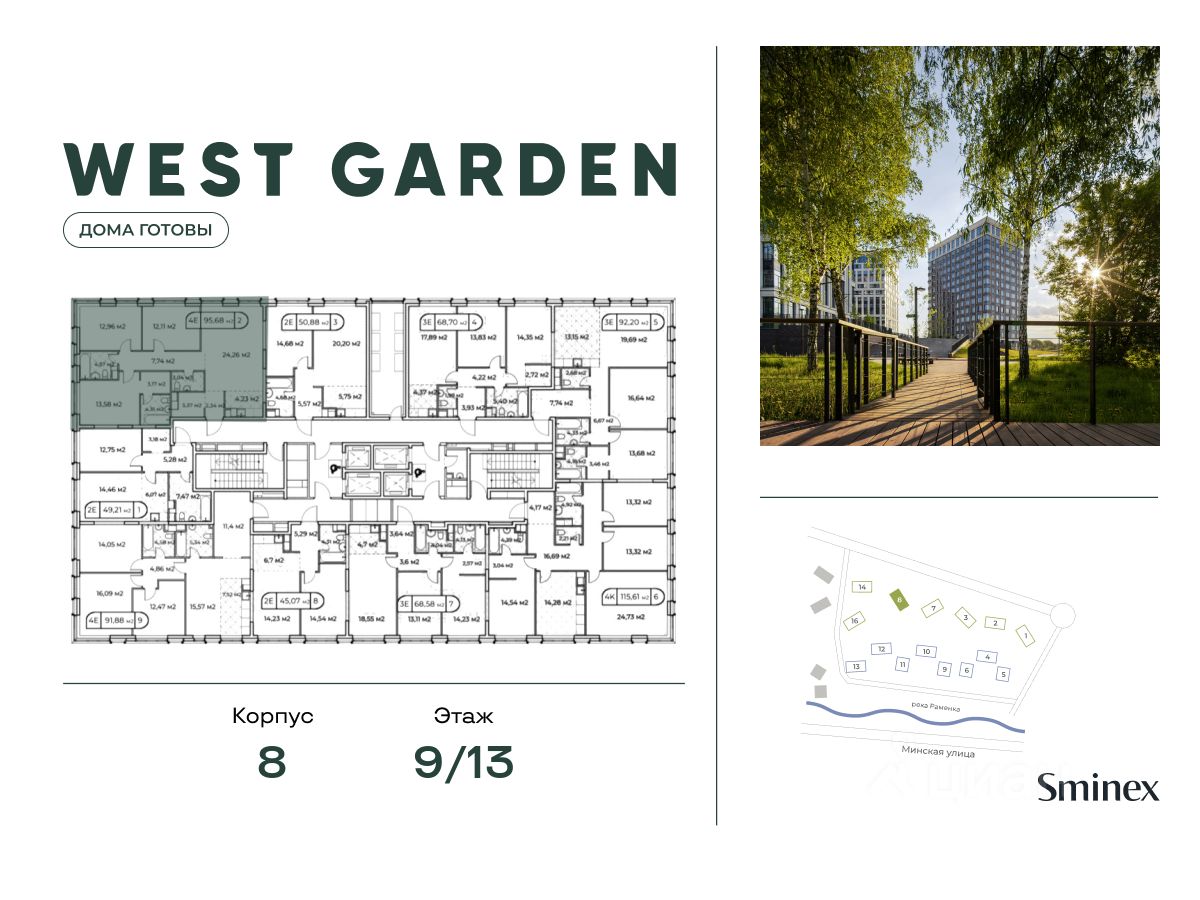 West Garden - это собрание клубных домов высотой 12-14 этажей в собственном парке 16 гектаров вдоль реки. Просторный среднеэтажный квартал расположен на Минской улице, в респектабельном Западном округе столицы. Вокруг премиальное окружение и более 1000 гектаров парков.