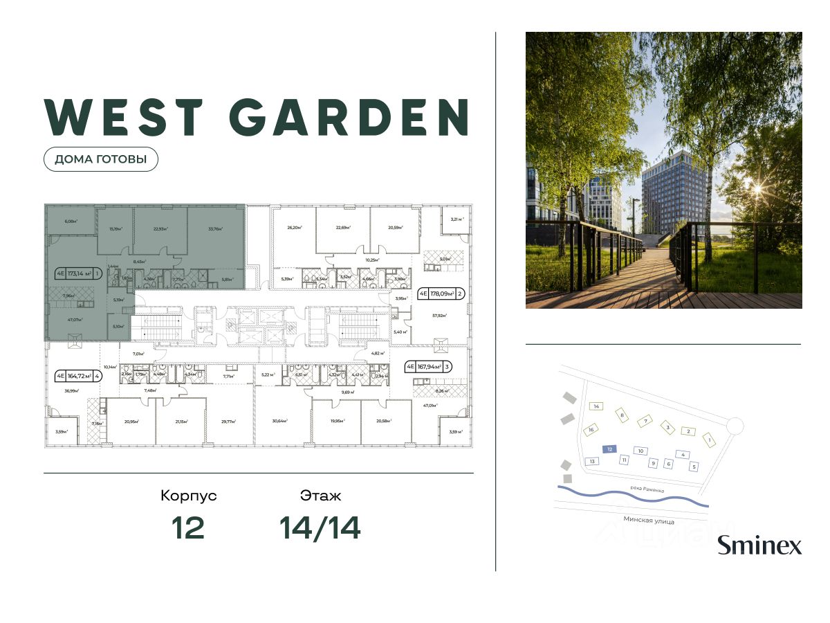 West Garden - это собрание клубных домов высотой 12-14 этажей в собственном парке 16 гектаров вдоль реки. Просторный среднеэтажный квартал расположен на Минской улице, в респектабельном Западном округе столицы. Вокруг премиальное окружение и более 1000 гектаров парков.