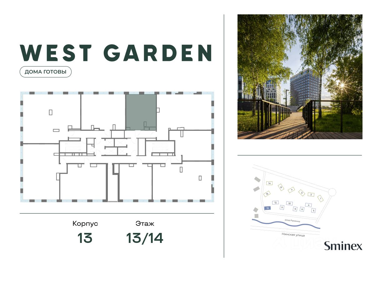 West Garden - это собрание клубных домов высотой 12-14 этажей в собственном парке 16 гектаров вдоль реки. Просторный среднеэтажный квартал расположен на Минской улице, в респектабельном Западном округе столицы. Вокруг премиальное окружение и более 1000 гектаров парков.