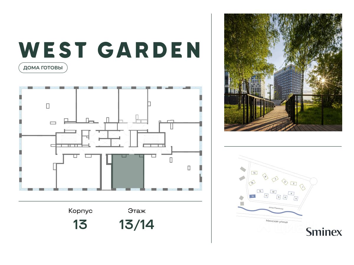 West Garden - это собрание клубных домов высотой 12-14 этажей в собственном парке 16 гектаров вдоль реки. Просторный среднеэтажный квартал расположен на Минской улице, в респектабельном Западном округе столицы. Вокруг премиальное окружение и более 1000 гектаров парков.