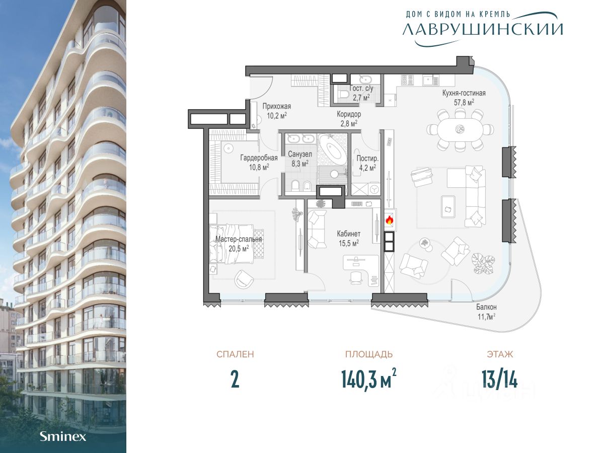 "Лаврушинский" - бескомпромиссный дом с лучшими видами на Кремль. Благодаря расположению всего в одном километре от Кремля, своей высоте и малоэтажной окружающей застройке, из квартир открываются поразительные прямые виды на главные достопримечательности центра Москвы, включая храм Христа Спасителя и собор Василия Блаженного. Расположение в глубине квартала, посередине парка, дает удивительное для центра ощущение тишины и простора. На закрытой территории находится самый большой на элитном рынке собственный ландшафтный парк площадью 1,4 га с фонтаном, ручьём, зонами для воркаута и тихого отдыха. KIDS LAB: развивающая детская площадка на улице и игровая комната в помещении. FIT LAB: фитнес-клуб с 25-метровым бассейном, beauty room, доступные только для жителей. В проекте уникальный выбор квартир с просторными балконами, пентхаусов с террасами, басcейнами и каминами, максимальными видовыми характеристиками, а также роскошных вилл. Всего - 153 квартиры и 101 продуманное планировочное решение. Высота потолков составляет от 3,5 до 8,25 м. В доме предусмотрен 2х-уровневый паркинг на 279 машино-места. В доме предусмотрен полный комплекс систем комфорта, включающий приточно-вытяжную вентиляцию с тонкой фильтрацией с принципом забора воздуха с высоты 50 метров для повышения продолжительности жизни, отдельный сервисный лифт для обслуживающего персонала и другие современные системы.