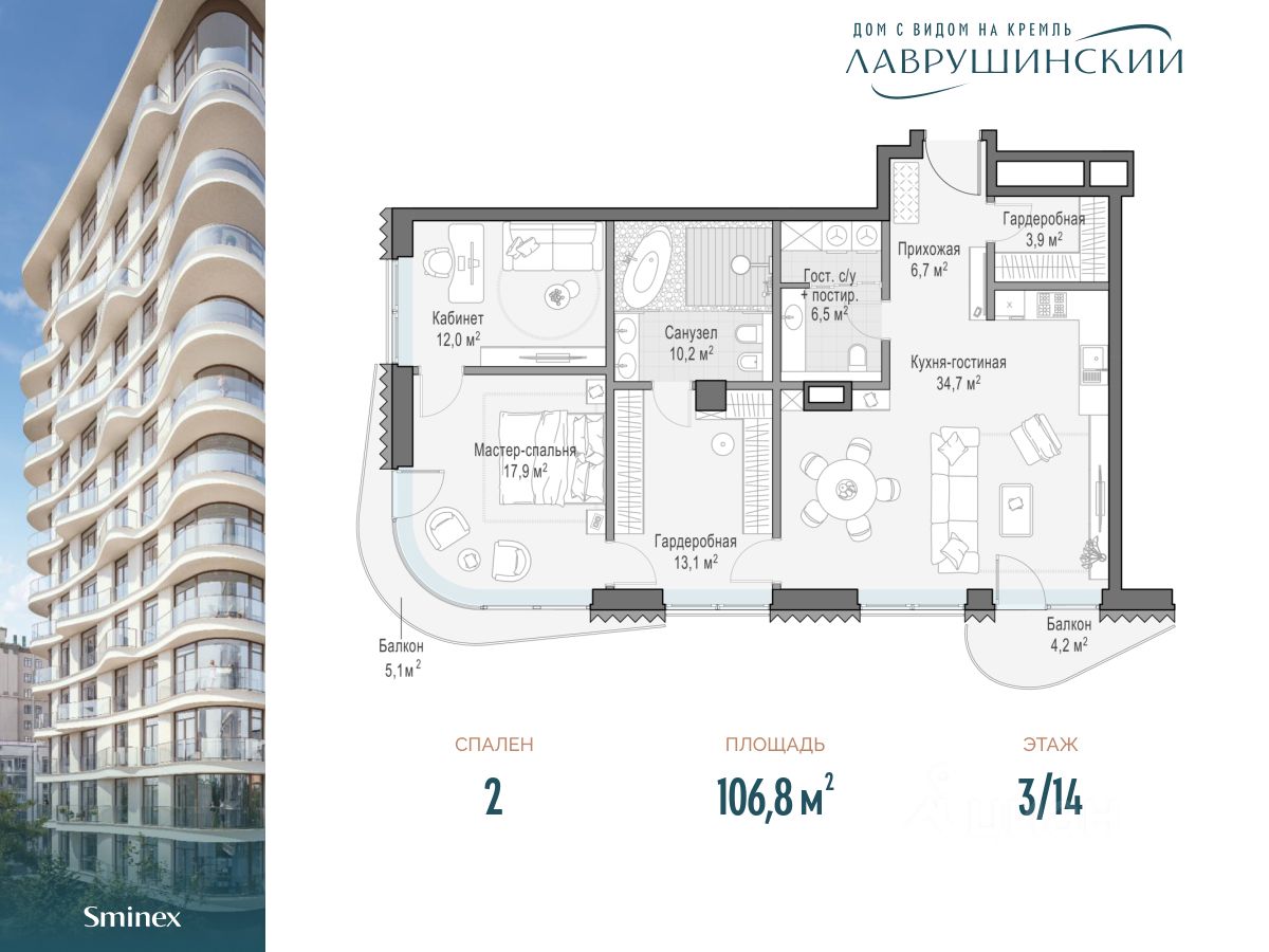 "Лаврушинский" - бескомпромиссный дом с лучшими видами на Кремль. Благодаря расположению всего в одном километре от Кремля, своей высоте и малоэтажной окружающей застройке, из квартир открываются поразительные прямые виды на главные достопримечательности центра Москвы, включая храм Христа Спасителя и собор Василия Блаженного. Расположение в глубине квартала, посередине парка, дает удивительное для центра ощущение тишины и простора. На закрытой территории находится самый большой на элитном рынке собственный ландшафтный парк площадью 1,4 га с фонтаном, ручьём, зонами для воркаута и тихого отдыха. KIDS LAB: развивающая детская площадка на улице и игровая комната в помещении. FIT LAB: фитнес-клуб с 25-метровым бассейном, beauty room, доступные только для жителей. В проекте уникальный выбор квартир с просторными балконами, пентхаусов с террасами, басcейнами и каминами, максимальными видовыми характеристиками, а также роскошных вилл. Всего - 153 квартиры и 101 продуманное планировочное решение. Высота потолков составляет от 3,5 до 8,25 м. В доме предусмотрен 2х-уровневый паркинг на 279 машино-места. В доме предусмотрен полный комплекс систем комфорта, включающий приточно-вытяжную вентиляцию с тонкой фильтрацией с принципом забора воздуха с высоты 50 метров для повышения продолжительности жизни, отдельный сервисный лифт для обслуживающего персонала и другие современные системы.
