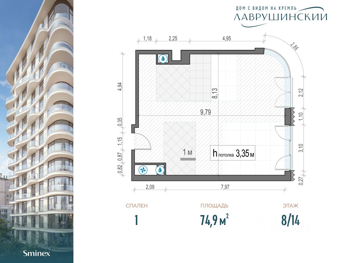"Лаврушинский" - бескомпромиссный дом с лучшими видами на Кремль. Благодаря расположению всего в одном километре от Кремля, своей высоте и малоэтажной окружающей застройке, из квартир открываются поразительные прямые виды на главные достопримечательности центра Москвы, включая храм Христа Спасителя и собор Василия Блаженного. Расположение в глубине квартала, посередине парка, дает удивительное для центра ощущение тишины и простора. На закрытой территории находится самый большой на элитном рынке собственный ландшафтный парк площадью 1,4 га с фонтаном, ручьём, зонами для воркаута и тихого отдыха. KIDS LAB: развивающая детская площадка на улице и игровая комната в помещении. FIT LAB: фитнес-клуб с 25-метровым бассейном, beauty room, доступные только для жителей. В проекте уникальный выбор квартир с просторными балконами, пентхаусов с террасами, басcейнами и каминами, максимальными видовыми характеристиками, а также роскошных вилл. Всего - 153 квартиры и 101 продуманное планировочное решение. Высота потолков составляет от 3,5 до 8,25 м. В доме предусмотрен 2х-уровневый паркинг на 279 машино-места. В доме предусмотрен полный комплекс систем комфорта, включающий приточно-вытяжную вентиляцию с тонкой фильтрацией с принципом забора воздуха с высоты 50 метров для повышения продолжительности жизни, отдельный сервисный лифт для обслуживающего персонала и другие современные системы.
