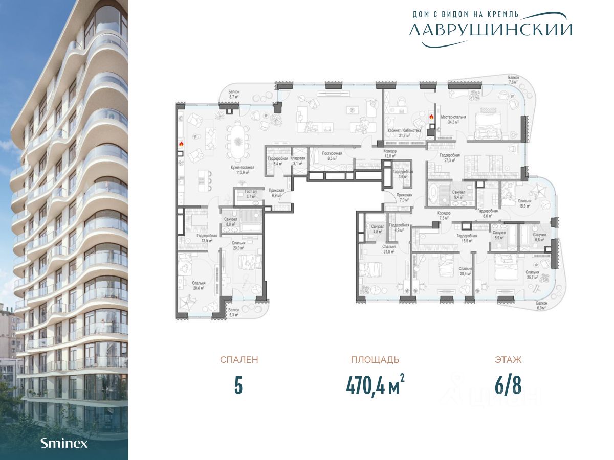 "Лаврушинский" - бескомпромиссный дом с лучшими видами на Кремль. Благодаря расположению всего в одном километре от Кремля, своей высоте и малоэтажной окружающей застройке, из квартир открываются поразительные прямые виды на главные достопримечательности центра Москвы, включая храм Христа Спасителя и собор Василия Блаженного. Расположение в глубине квартала, посередине парка, дает удивительное для центра ощущение тишины и простора. На закрытой территории находится самый большой на элитном рынке собственный ландшафтный парк площадью 1,4 га с фонтаном, ручьём, зонами для воркаута и тихого отдыха. KIDS LAB: развивающая детская площадка на улице и игровая комната в помещении. FIT LAB: фитнес-клуб с 25-метровым бассейном, beauty room, доступные только для жителей. В проекте уникальный выбор квартир с просторными балконами, пентхаусов с террасами, басcейнами и каминами, максимальными видовыми характеристиками, а также роскошных вилл. Всего - 153 квартиры и 101 продуманное планировочное решение. Высота потолков составляет от 3,5 до 8,25 м. В доме предусмотрен 2х-уровневый паркинг на 279 машино-места. В доме предусмотрен полный комплекс систем комфорта, включающий приточно-вытяжную вентиляцию с тонкой фильтрацией с принципом забора воздуха с высоты 50 метров для повышения продолжительности жизни, отдельный сервисный лифт для обслуживающего персонала и другие современные системы.