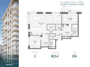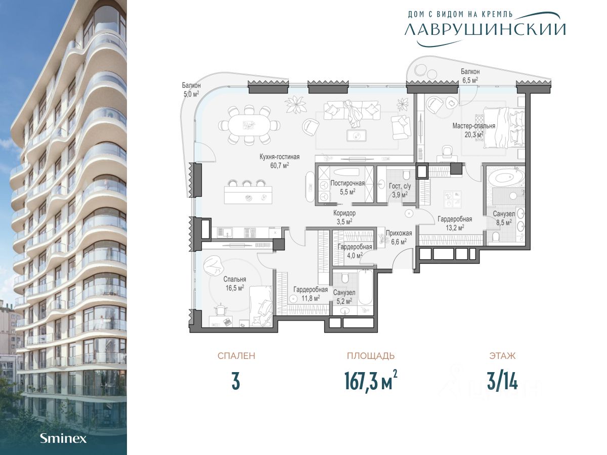 "Лаврушинский" - бескомпромиссный дом с лучшими видами на Кремль. Благодаря расположению всего в одном километре от Кремля, своей высоте и малоэтажной окружающей застройке, из квартир открываются поразительные прямые виды на главные достопримечательности центра Москвы, включая храм Христа Спасителя и собор Василия Блаженного. Расположение в глубине квартала, посередине парка, дает удивительное для центра ощущение тишины и простора. На закрытой территории находится самый большой на элитном рынке собственный ландшафтный парк площадью 1,4 га с фонтаном, ручьём, зонами для воркаута и тихого отдыха. KIDS LAB: развивающая детская площадка на улице и игровая комната в помещении. FIT LAB: фитнес-клуб с 25-метровым бассейном, beauty room, доступные только для жителей. В проекте уникальный выбор квартир с просторными балконами, пентхаусов с террасами, басcейнами и каминами, максимальными видовыми характеристиками, а также роскошных вилл. Всего - 153 квартиры и 101 продуманное планировочное решение. Высота потолков составляет от 3,5 до 8,25 м. В доме предусмотрен 2х-уровневый паркинг на 279 машино-места. В доме предусмотрен полный комплекс систем комфорта, включающий приточно-вытяжную вентиляцию с тонкой фильтрацией с принципом забора воздуха с высоты 50 метров для повышения продолжительности жизни, отдельный сервисный лифт для обслуживающего персонала и другие современные системы.