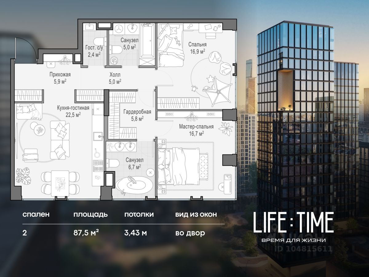 Life Time - роскошный современный квартал на Пресне, в наиболее быстро растущем премиальном районе ЦАО. Его насыщенная инфраструктура и выгодное расположение дарят время для жизни. Вы больше не тратите его на дорогу или ожидание, при этом ни в чём себе не отказывая. На территории предусмотрено всё для комфортной жизни: • двор-парк площадью 1,8 гектара с прудом и фонтанами; • Clubhouse - инфраструктурный центр в отдельном здании с исчерпывающими возможностями для спорта, отдыха и досуга только для жителей; • спортивная инфраструктура на улице и в помещении, в том числе бассейн длиной 25 метров, хот-таб, хаммам, сауна, бьюти-зона; • клубная гостиная с террасой; • всё для развития и досуга детей любого возраста, в том числе детский сад и школа. Life Time находится в центре сложившегося премиального района, в окружении многочисленных парков. Удобная транспортная доступность и прямой выезд на Звенигородское шоссе позволяют без проблем добраться до Садового кольца и Москва-Сити. Архитектурный стиль квартала - роскошный минимализм. Дома десятилетиями будут выглядеть современно. В Life Time представлен широкий выбор как квартир, так и особых форматов: двухэтажные пентхаусы с каминами и террасами, скай-виллы.