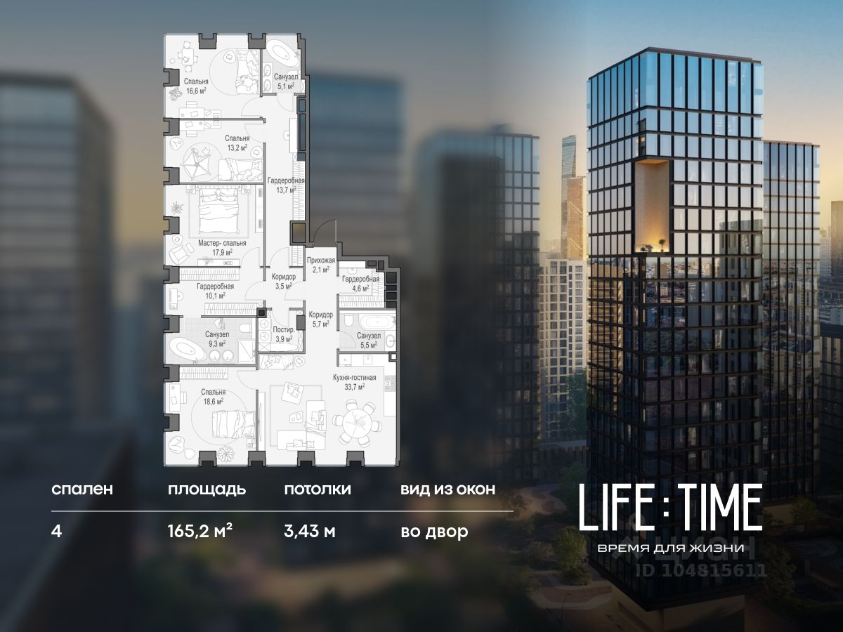 Просторная светлая квартира площадью 165,2 кв. м. Кухня-гостиная (33,7 кв. м) обращена окнами в сторону Москва-Сити, а спальни - на парк "Красногвардейские пруды". Продуманная планировка позволяет разместить кабинет и три спальни. Мастер-спальня с отдельным санузлом и гардеробом. Окна квартиры выходят на северную, западную и южную стороны.