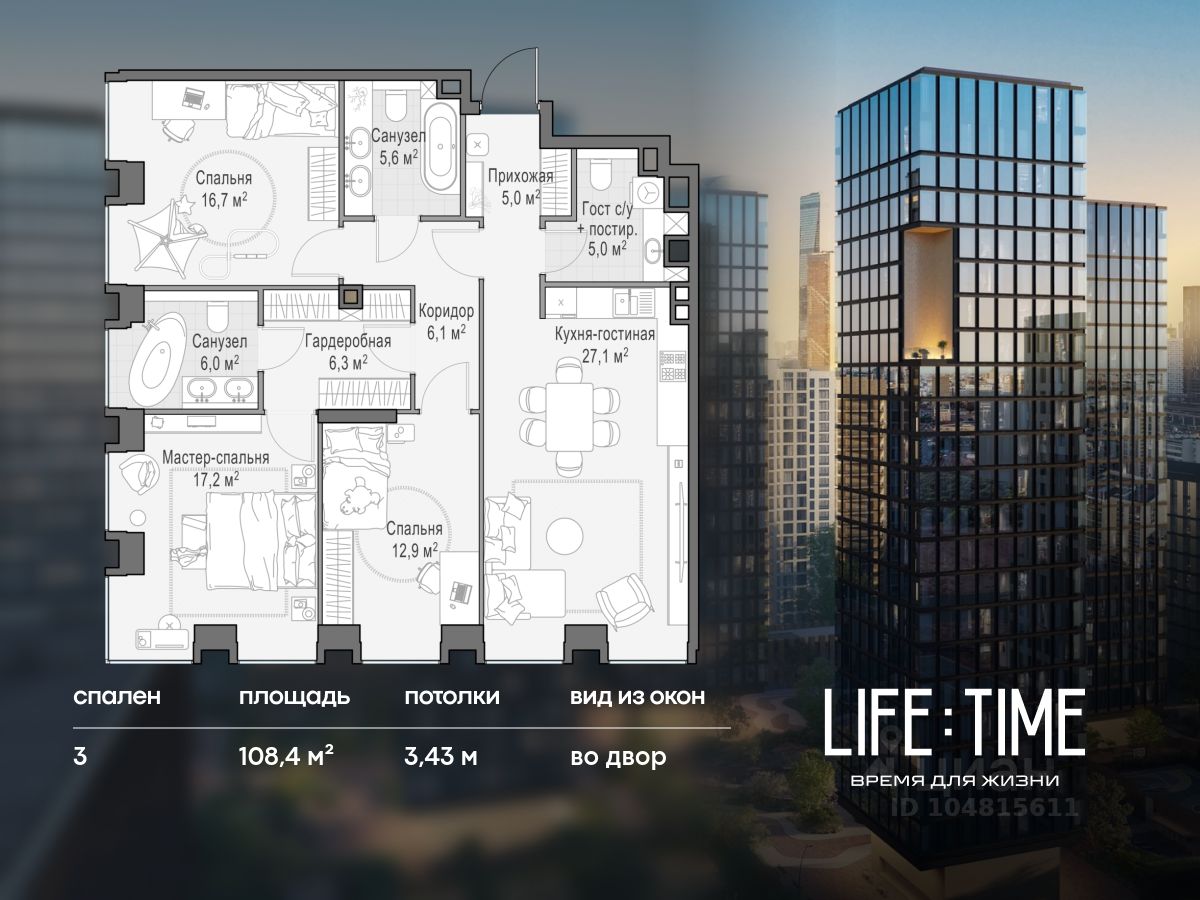 Просторная квартира (108,4 кв. м) с продуманной планировкой. Окна выходят на западную и южную стороны. Из них открываются виды на цветущий двор-парк с ландшафтным дизайном и пруд. Продуманная планировка позволяет разместить кухню-гостиную и три спальни. Расположение квартиры позволяет наслаждаться атмосферой тишины и комфорта.