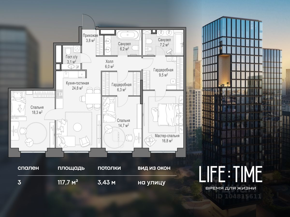 Life Time - роскошный современный квартал на Пресне, в наиболее быстро растущем премиальном районе ЦАО. Его насыщенная инфраструктура и выгодное расположение дарят время для жизни. Вы больше не тратите его на дорогу или ожидание, при этом ни в чём себе не отказывая. На территории предусмотрено всё для комфортной жизни: • двор-парк площадью 1,8 гектара с прудом и фонтанами; • Clubhouse - инфраструктурный центр в отдельном здании с исчерпывающими возможностями для спорта, отдыха и досуга только для жителей; • спортивная инфраструктура на улице и в помещении, в том числе бассейн длиной 25 метров, хот-таб, хаммам, сауна, бьюти-зона; • клубная гостиная с террасой; • всё для развития и досуга детей любого возраста, в том числе детский сад и школа. Life Time находится в центре сложившегося премиального района, в окружении многочисленных парков. Удобная транспортная доступность и прямой выезд на Звенигородское шоссе позволяют без проблем добраться до Садового кольца и Москва-Сити. Архитектурный стиль квартала - роскошный минимализм. Дома десятилетиями будут выглядеть современно. В Life Time представлен широкий выбор как квартир, так и особых форматов: двухэтажные пентхаусы с каминами и террасами, скай-виллы.