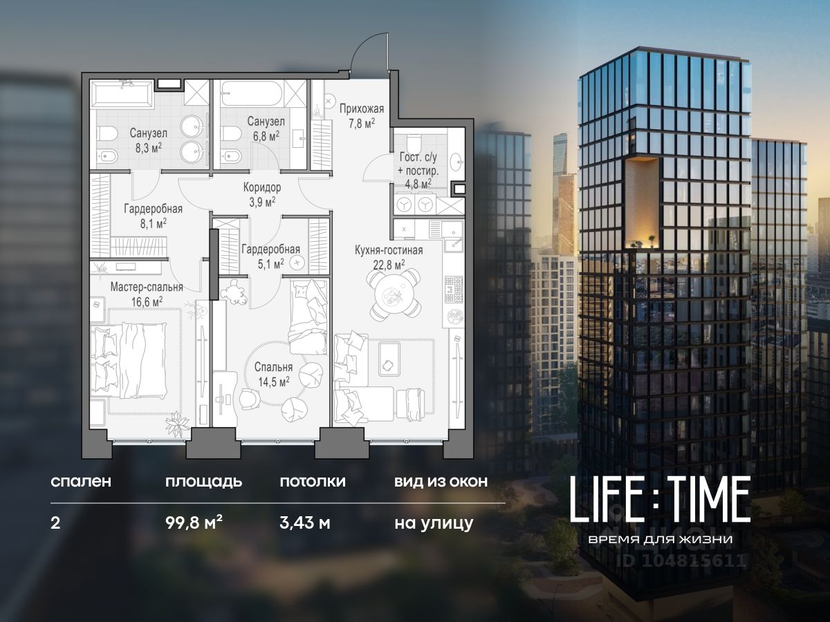 Life Time - роскошный современный квартал на Пресне, в наиболее быстро растущем премиальном районе ЦАО. Его насыщенная инфраструктура и выгодное расположение дарят время для жизни. Вы больше не тратите его на дорогу или ожидание, при этом ни в чём себе не отказывая. На территории предусмотрено всё для комфортной жизни: • двор-парк площадью 1,8 гектара с прудом и фонтанами; • Clubhouse - инфраструктурный центр в отдельном здании с исчерпывающими возможностями для спорта, отдыха и досуга только для жителей; • спортивная инфраструктура на улице и в помещении, в том числе бассейн длиной 25 метров, хот-таб, хаммам, сауна, бьюти-зона; • клубная гостиная с террасой; • всё для развития и досуга детей любого возраста, в том числе детский сад и школа. Life Time находится в центре сложившегося премиального района, в окружении многочисленных парков. Удобная транспортная доступность и прямой выезд на Звенигородское шоссе позволяют без проблем добраться до Садового кольца и Москва-Сити. Архитектурный стиль квартала - роскошный минимализм. Дома десятилетиями будут выглядеть современно. В Life Time представлен широкий выбор как квартир, так и особых форматов: двухэтажные пентхаусы с каминами и террасами, скай-виллы.