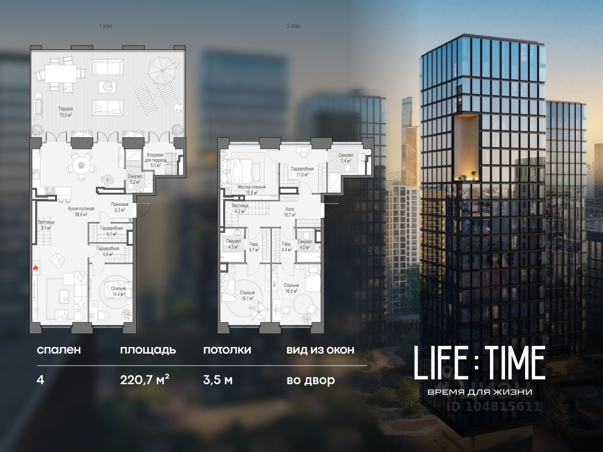 Life Time - роскошный современный квартал на Пресне, в наиболее быстро растущем премиальном районе ЦАО. Его насыщенная инфраструктура и выгодное расположение дарят время для жизни. Вы больше не тратите его на дорогу или ожидание, при этом ни в чём себе не отказывая. На территории предусмотрено всё для комфортной жизни: • двор-парк площадью 1,8 гектара с прудом и фонтанами; • Clubhouse - инфраструктурный центр в отдельном здании с исчерпывающими возможностями для спорта, отдыха и досуга только для жителей; • спортивная инфраструктура на улице и в помещении, в том числе бассейн длиной 25 метров, хот-таб, хаммам, сауна, бьюти-зона; • клубная гостиная с террасой; • всё для развития и досуга детей любого возраста, в том числе детский сад и школа. Life Time находится в центре сложившегося премиального района, в окружении многочисленных парков. Удобная транспортная доступность и прямой выезд на Звенигородское шоссе позволяют без проблем добраться до Садового кольца и Москва-Сити. Архитектурный стиль квартала - роскошный минимализм. Дома десятилетиями будут выглядеть современно. В Life Time представлен широкий выбор как квартир, так и особых форматов: двухэтажные пентхаусы с каминами и террасами, скай-виллы.