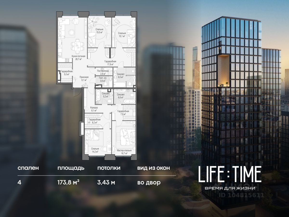 Life Time - роскошный современный квартал на Пресне, в наиболее быстро растущем премиальном районе ЦАО. Его насыщенная инфраструктура и выгодное расположение дарят время для жизни. Вы больше не тратите его на дорогу или ожидание, при этом ни в чём себе не отказывая. На территории предусмотрено всё для комфортной жизни: • двор-парк площадью 1,8 гектара с прудом и фонтанами; • Clubhouse - инфраструктурный центр в отдельном здании с исчерпывающими возможностями для спорта, отдыха и досуга только для жителей; • спортивная инфраструктура на улице и в помещении, в том числе бассейн длиной 25 метров, хот-таб, хаммам, сауна, бьюти-зона; • клубная гостиная с террасой; • всё для развития и досуга детей любого возраста, в том числе детский сад и школа. Life Time находится в центре сложившегося премиального района, в окружении многочисленных парков. Удобная транспортная доступность и прямой выезд на Звенигородское шоссе позволяют без проблем добраться до Садового кольца и Москва-Сити. Архитектурный стиль квартала - роскошный минимализм. Дома десятилетиями будут выглядеть современно. В Life Time представлен широкий выбор как квартир, так и особых форматов: двухэтажные пентхаусы с каминами и террасами, скай-виллы.