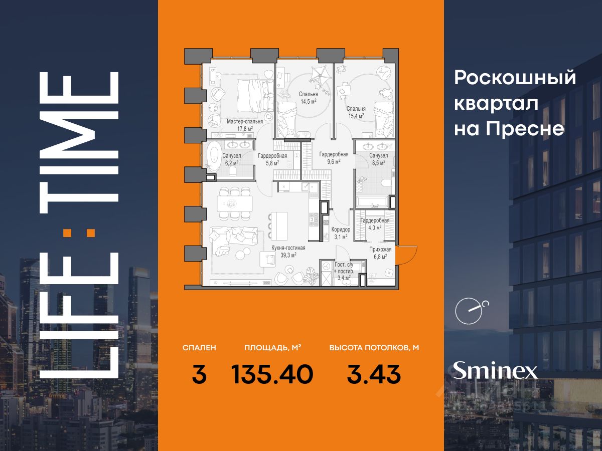 Просторная светлая квартира площадью 135,4 кв. м с окнами на южной и западной сторонах. В просторной кухне-гостиной (39,3 кв. м) они обращены в направлении Москва-Сити, а панорамное остекление улучшает видовые характеристики квартиры. Продуманная планировка позволяет разместить три спальни, выходящие окнами в сторону парка "Красногвардейские пруды". В мастер-спальне предусмотрены просторная гардеробная и санузел с окном.