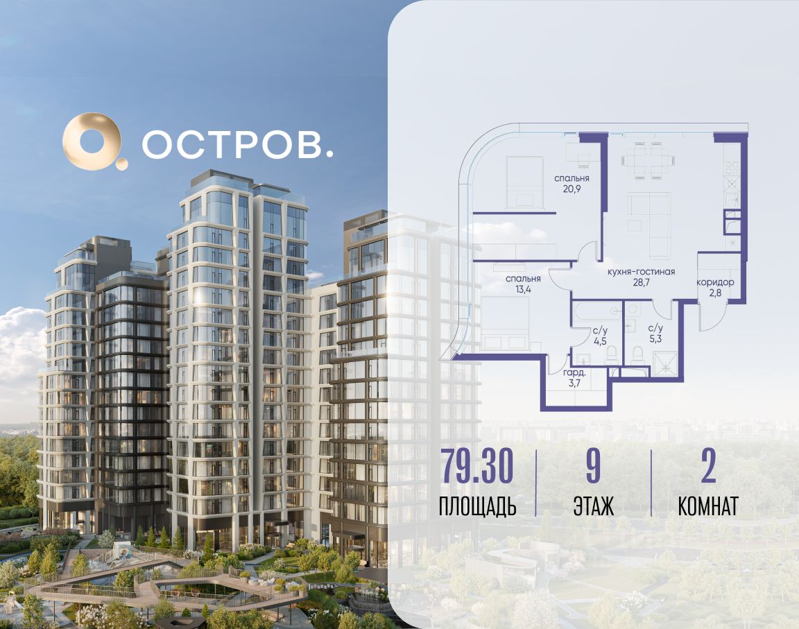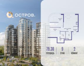 Продаётся 2-комн. квартира от застройщика: общая площадь 79.30 м², жилая 34.30 м², кухня 28.70 м², 9-й этаж, жилой квартал "Остров 12", корпус 3 (секция 1). Срок сдачи: 1 квартал 2029 года.
