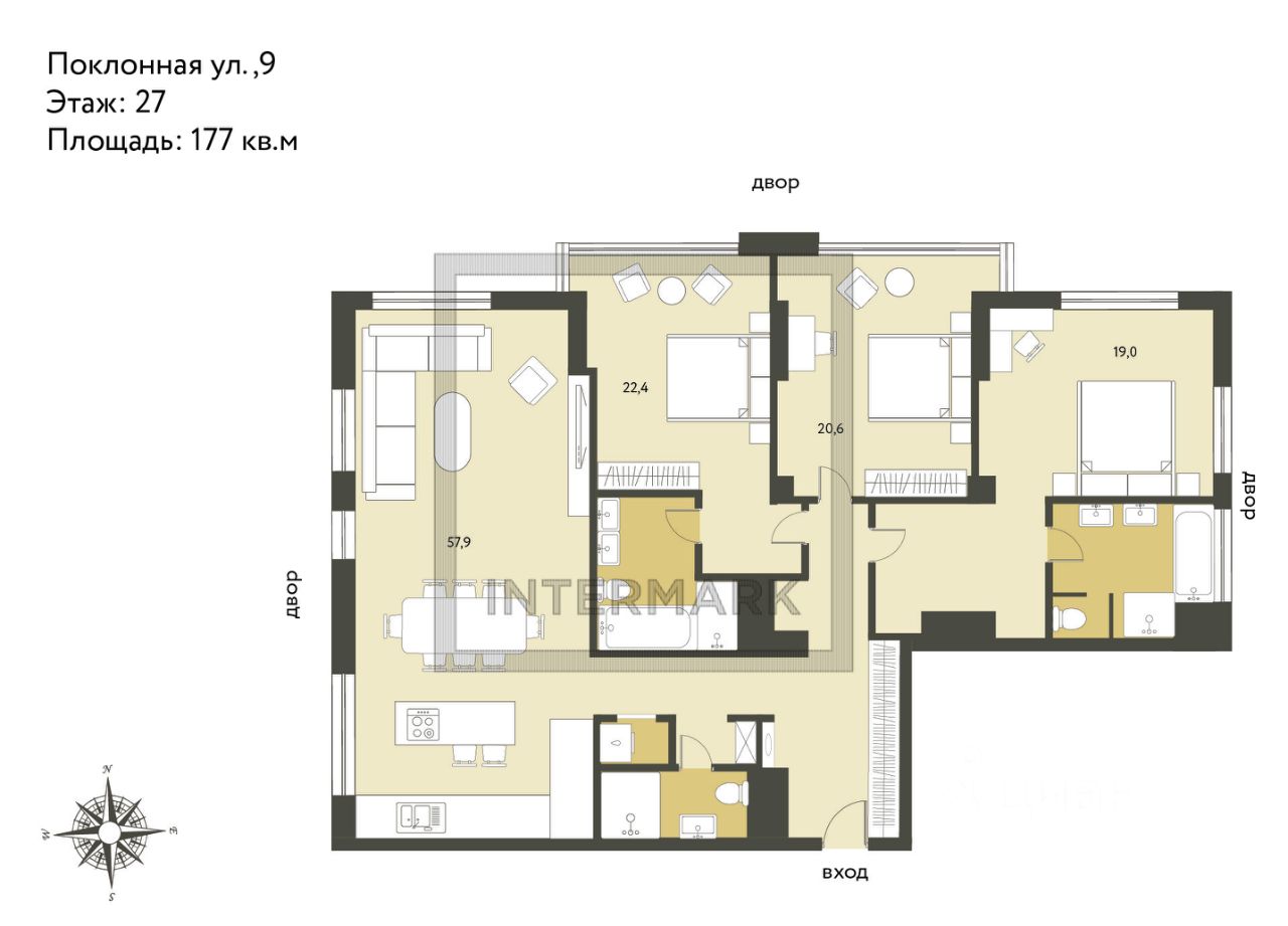 Откройте для себя жизнь на высоте, где из панорамных окон открываются виды на знаковые достопримечательности столицы. Эти апартаменты площадью 177 м² в клубном доме "Поклонная 9" - это редкое сочетание престижной локации, стильного дизайна и насыщенной инфраструктуры.