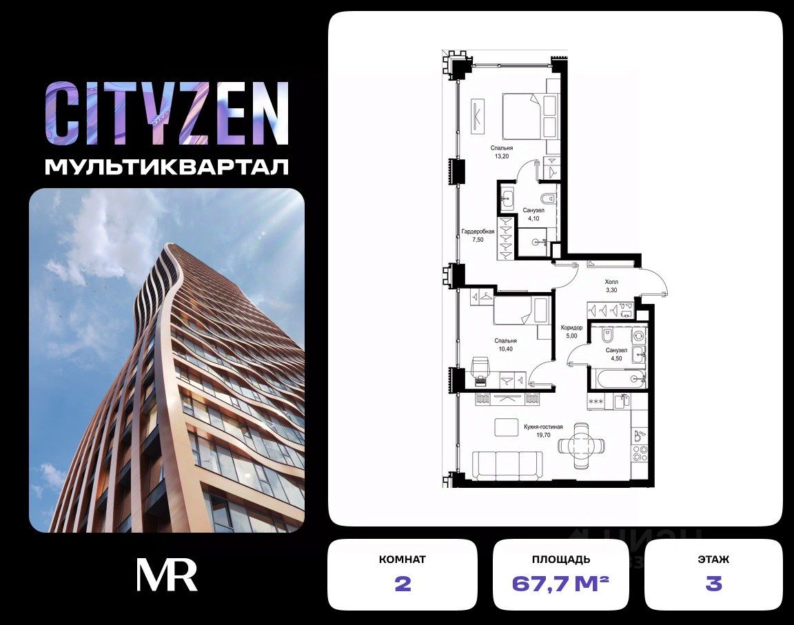 Продается 2-комнатная квартира от застройщика в жилом мультиквартале CITYZEN на 3-м этаже в корпусе #8 урбан-блока VOLNA. Общая площадь лота составляет 67.70 м²